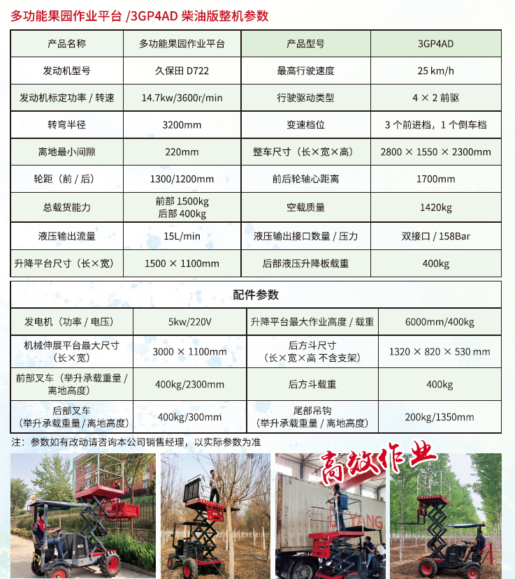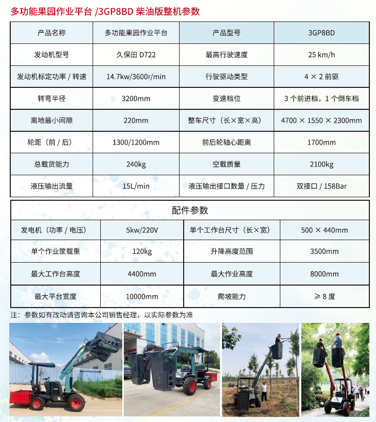 多功能高空作业平台集多种功能于一体,具有一机多用、安全高效等特点。平台动力分为柴油动力和电动动力,柴油版采用原装进口久保田发动机,省油更放心,电动版采用电池组,动力强劲,经济环保。可自由搭配各种配套装配,可实现修剪等高空作业、养护、搬运、运输、吊装、户外发电等功能。